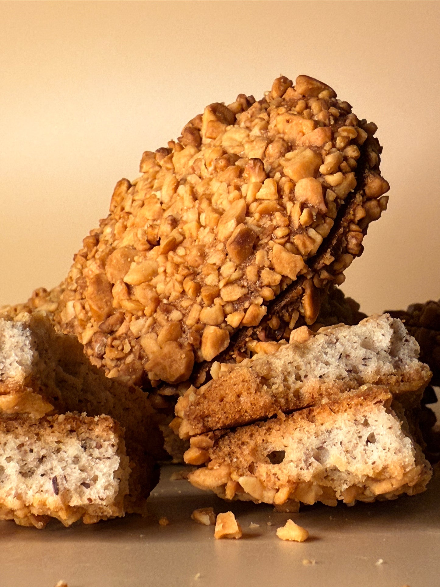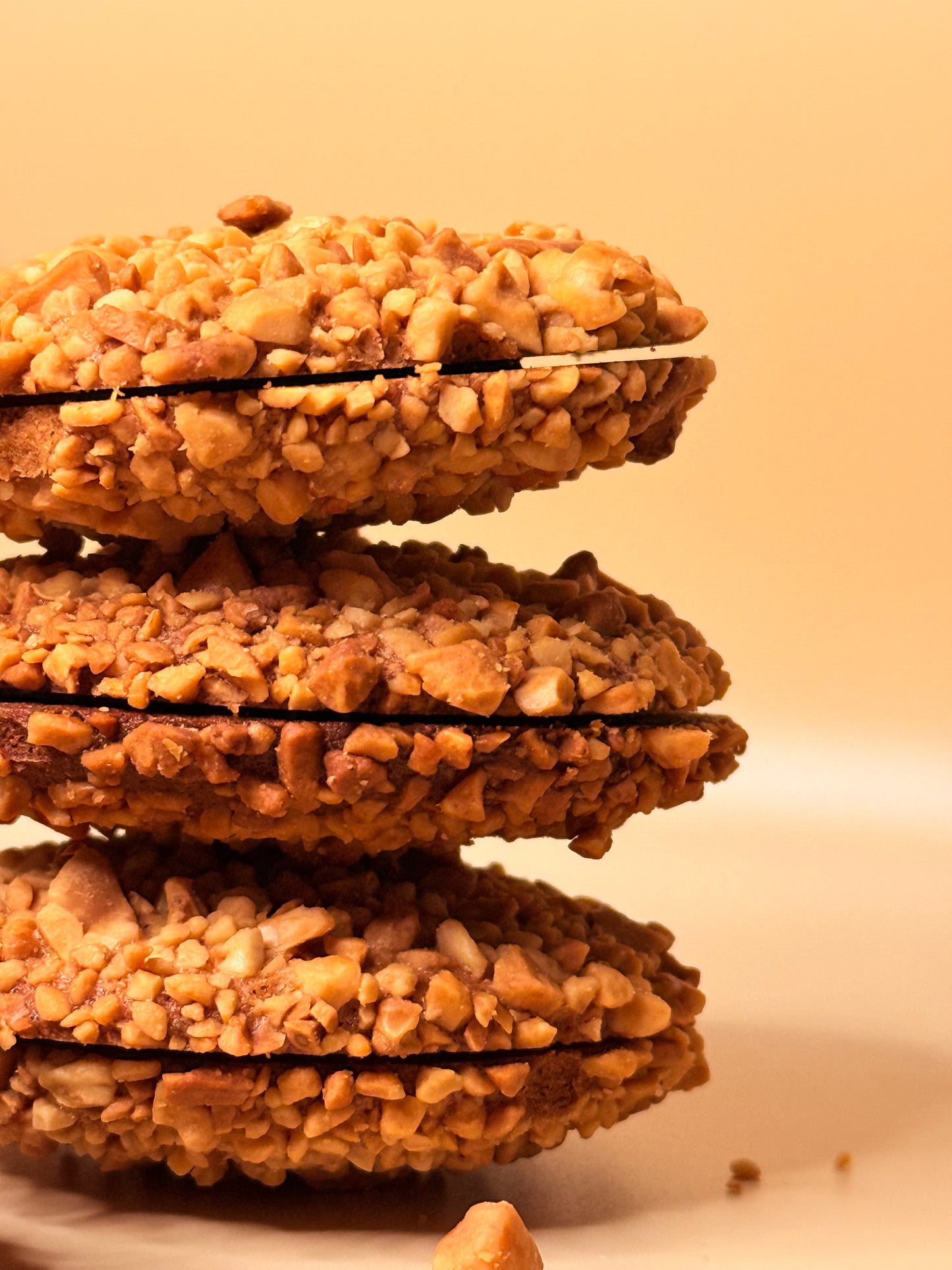 ラングドシャ生地にピーナッツをまぶし、プラリネピーナッツペーストをサンド。ざくざくのピーナッツの食感がクセになる逸品です。【賞味期限:お届け日からおおよそ20日~1ヶ月】